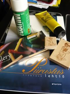 Tällaisia siis lähti mukaan, fixatiivi ja pastelliliidut oli Lahden kokeita varten hankitut. Leimasimet ovat heikkouteni, ja tuo saippuakuplapoika oli jotenkin niin suloinen etten kestä. Nappasin sille sitten vielä koiraleimasimen kaveriksi, miten ihainia kortteja noista saakaan :)